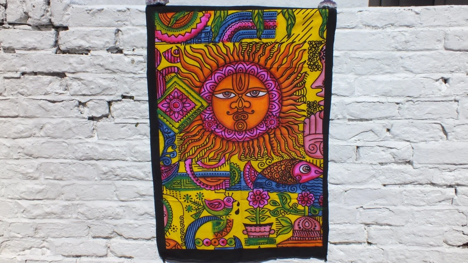 Sun hand brushed wall art with a large sun surrounded by some other interesting sights with beautiful bright colourful art work.